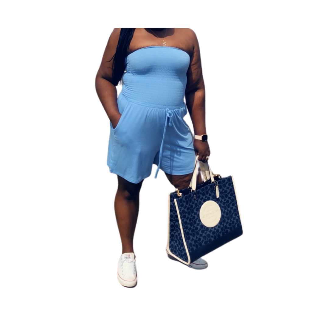 Stay comfortable in style with the Bella blue romper. This tube-shaped, smock romper features deep pockets, perfect for carrying your essentials. Created from breezy fabric, it's ideal for warm weather days.You know the vibes!