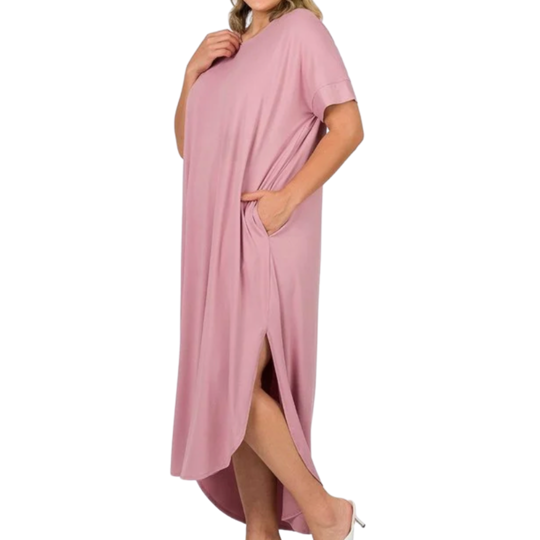 This plus size maxi dress stands out with its buttery soft textured fabric and features. The cuffed, short sleeves with a rounded neckline provide for a flattering fit while the pockets and high-low hemline add the perfect touch. Add a stylish accent to your wardrobe today.