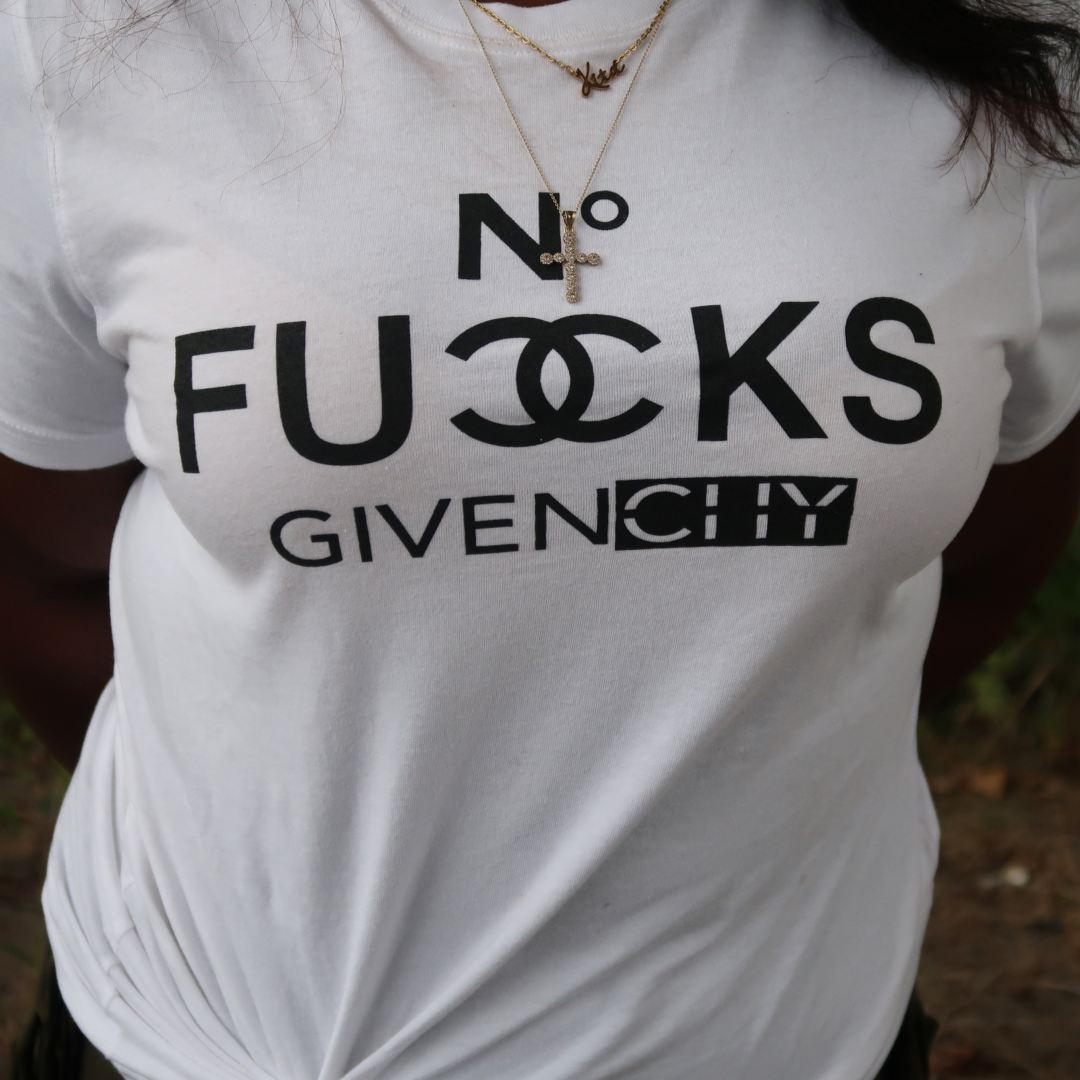 No Fuccks Given chy unisex graphic tee in white. Classic men tee fit. Available in size S- XL. Size medium worn in photo.