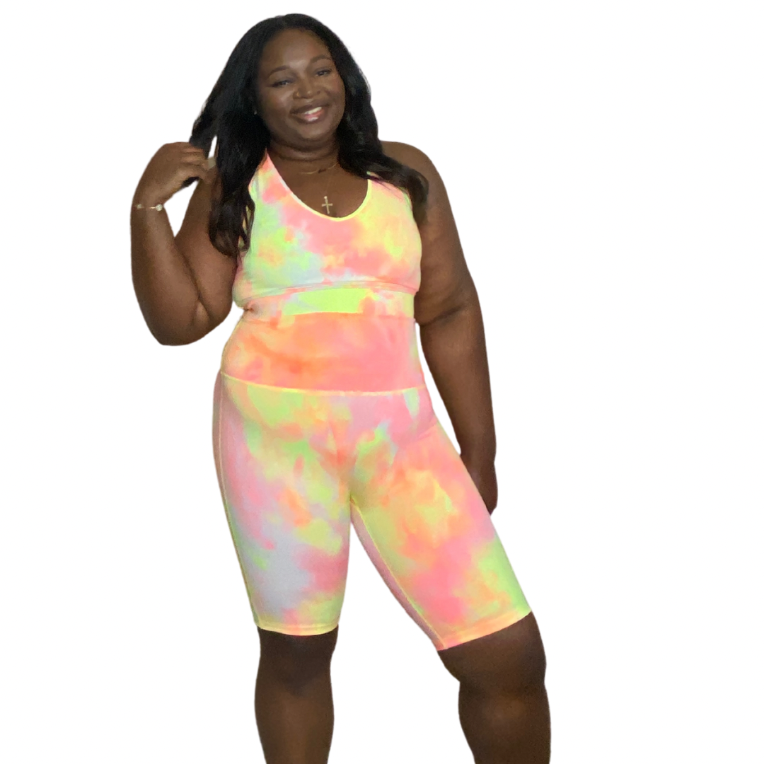 multicolor tie dye racerback crop top and matching high waisted biker shorts active set.