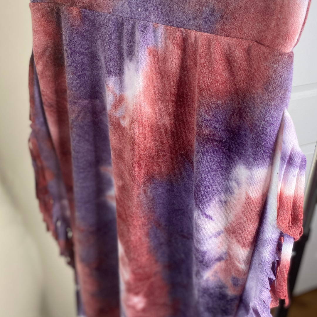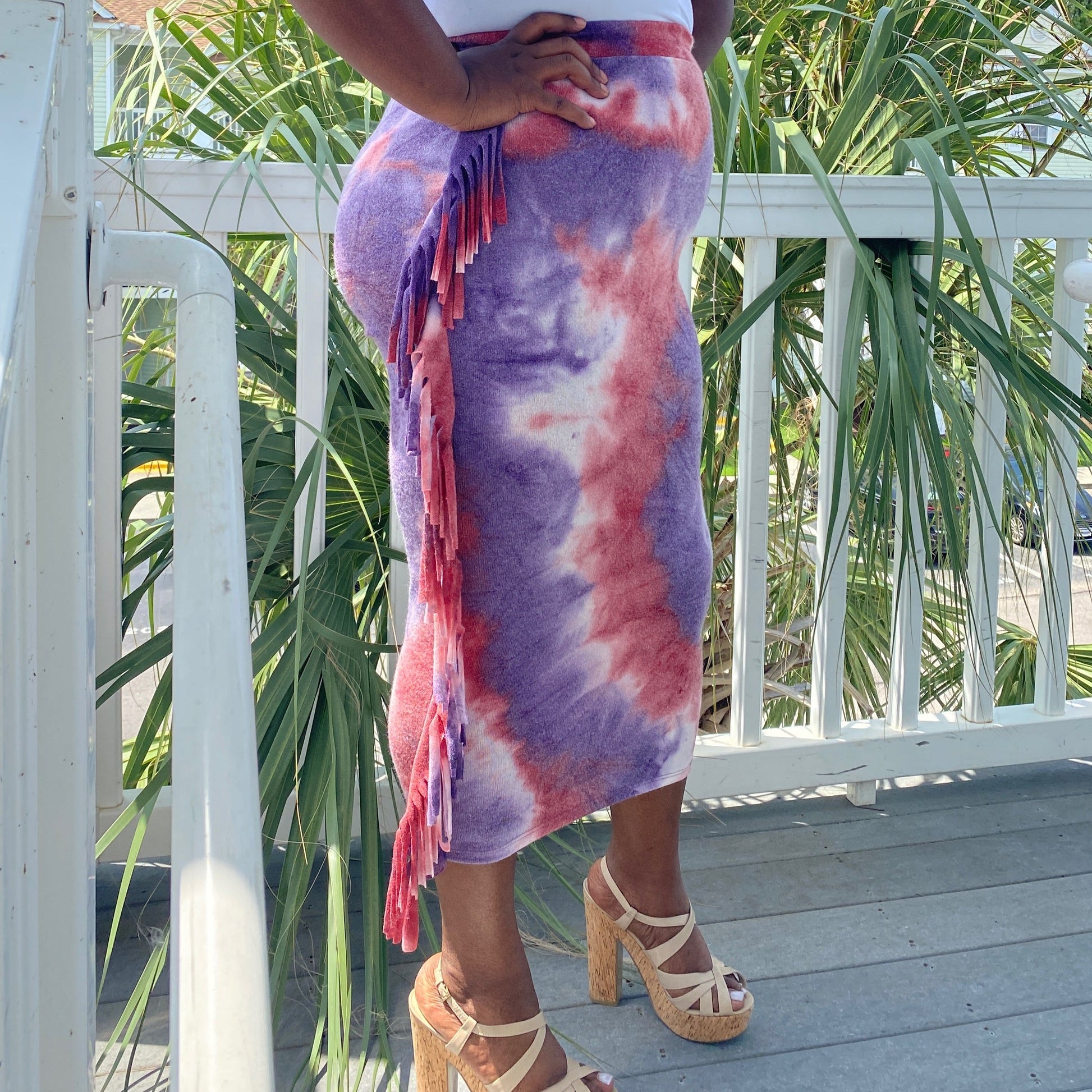 Acrylic like material long midi skirt with elastic high waist band and fringe trim details on the sides in red, purple and white tie dye. Large worn in photo.