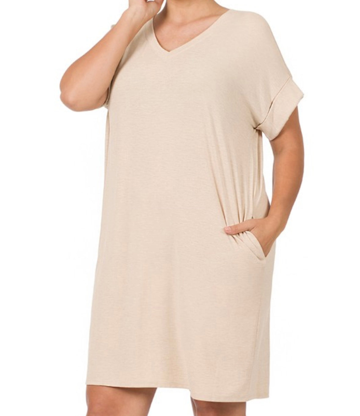 Indulge in luxurious comfort with our short sleeve dress. The buttery soft fabric flows effortlessly while the relaxed fit flatters all body types. With a v-neck and cuffed sleeves, this dress is perfect for any occasion. Convenient deep pockets make it a must-have for your wardrobe.